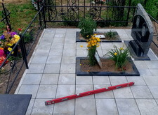 Подготовленную почву застелили геотекстилем, который будет препятствовать проростанию сорной травы в плиточных швах. В это же время на территории могилы были дополнительно установлены лавочка и столик.