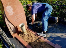 Приехав на кладбище, первым делом мы удалили кустарник, закрывающий памятник. Затем тщательно подмели цветник и территорию участка, после чего вытерли надгробье.